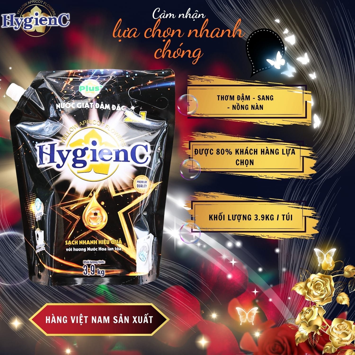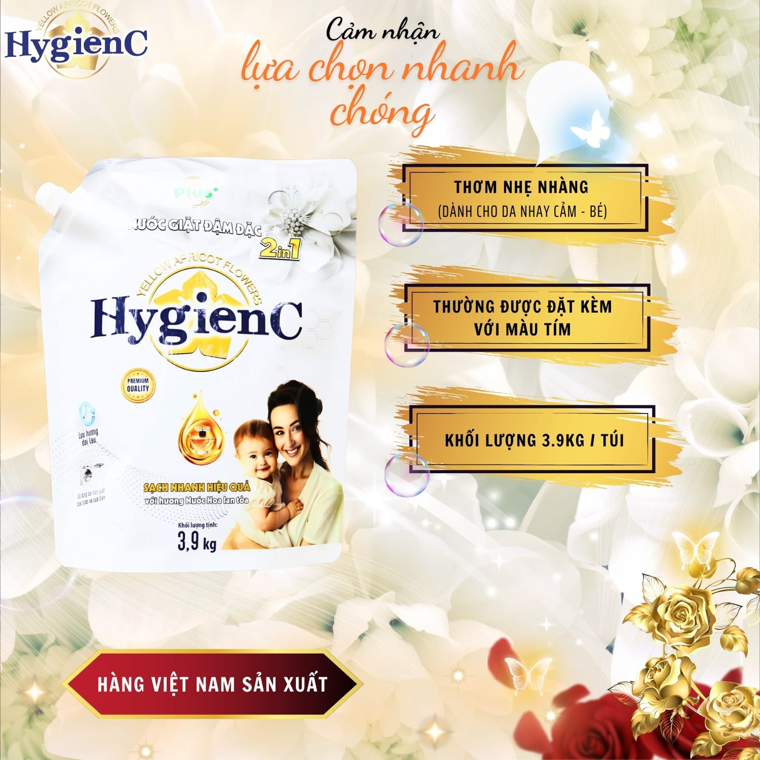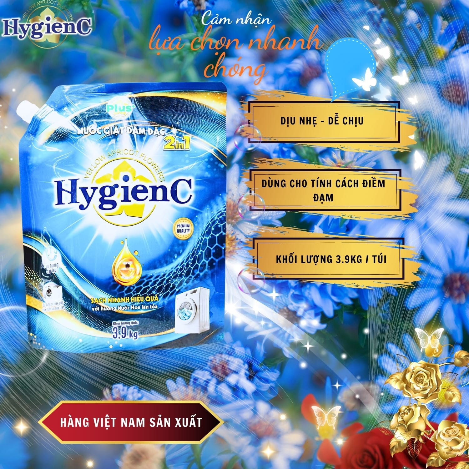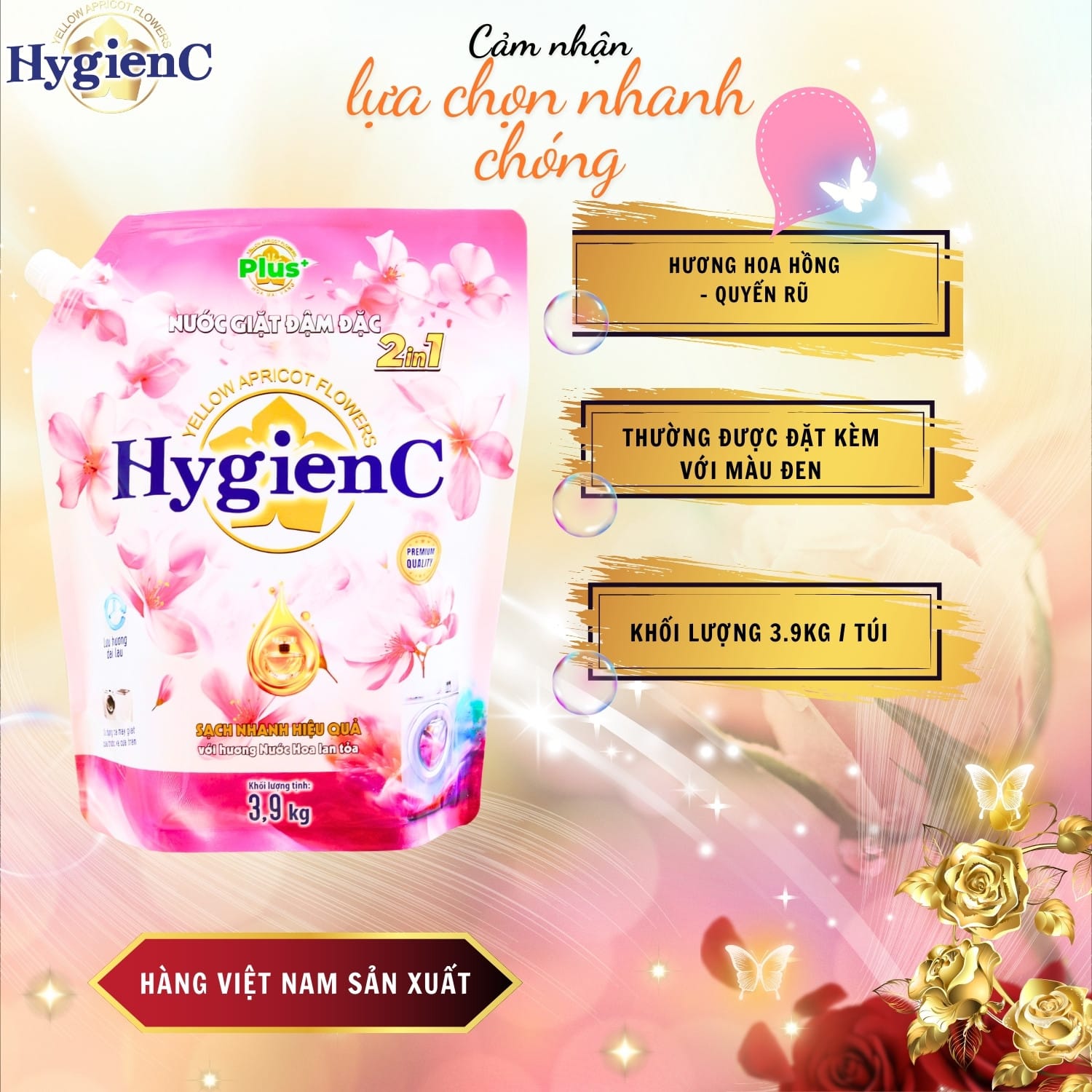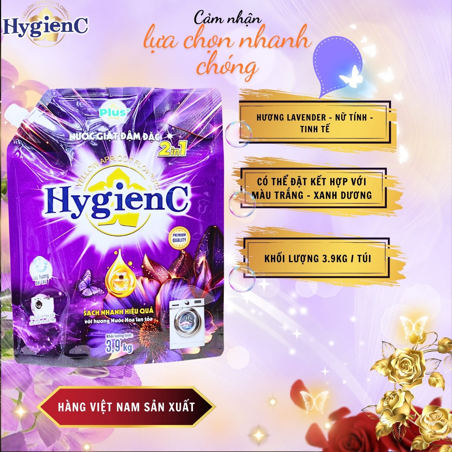– Nước giặt quần áo HygienC Plus+ là sản phẩm 2 trong 1 có công dụng vừa giặt vừa xả. Công thức chống tĩnh điện của nước giặt quần áo HygienC Plus+ giúp quần áo luôn xốp, ủi (là) một cách dễ dàng. Ngoài ra, sản phẩm còn giúp bạn giặt sạch những vết bẩn khó giặt nhất mà các loại nước giặt khác không giặt được, giữ màu quần áo luôn tươi mới và lưu lại mùi hương nhẹ nhàng, quyến rũ trên quần áo sau khi giặt.